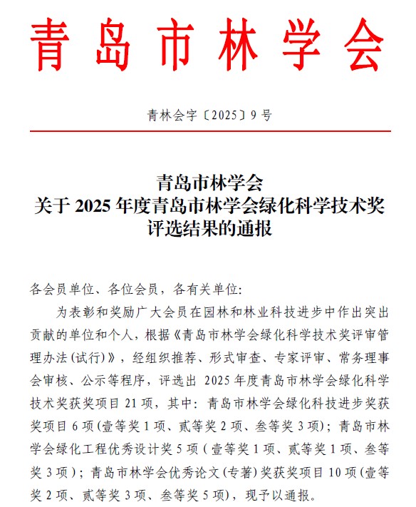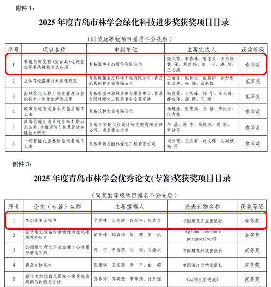 日前,青岛市林学会公布了2025年度“青岛市林学会绿化科学技术奖”评审结果。冠中生态凭借“节理裂隙发育(灰岩类)边坡生态修复关键技术及应用”成果,获绿化科技进步奖一等奖;出版的《生态修复工程学》,获青岛市林学会优秀论文(专著)奖一等奖。